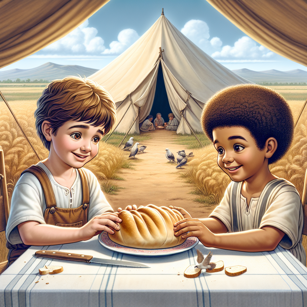 Imaginez une grande table débordante de nourritures délicieuses, de fruits sucrés, de pains dorés et de miel parfumé. Cette table n'est pas juste une table de festin. C'est une table de paix et d'amitié, spécialement dressée pour Isaac et Ismaël. Aujourd'hui, les enfants, nous allons voyager dans le temps, jusqu'à une terre lointaine, pour découvrir le festin doux de la paix qui unit deux frères dans l'histoire de la Bible.